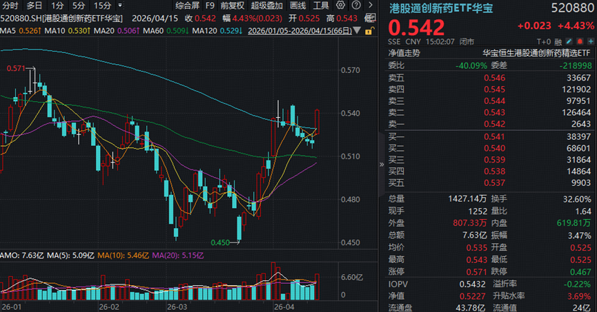 港股通创新药攻势尤为迅猛, 520880午后一度涨至4.62%,全天成交7.63亿元,较昨日激增八成!光脚大阳线强势终结五连阴,单日突破5日、10日及半年线等3根均线,彰显多头力量。