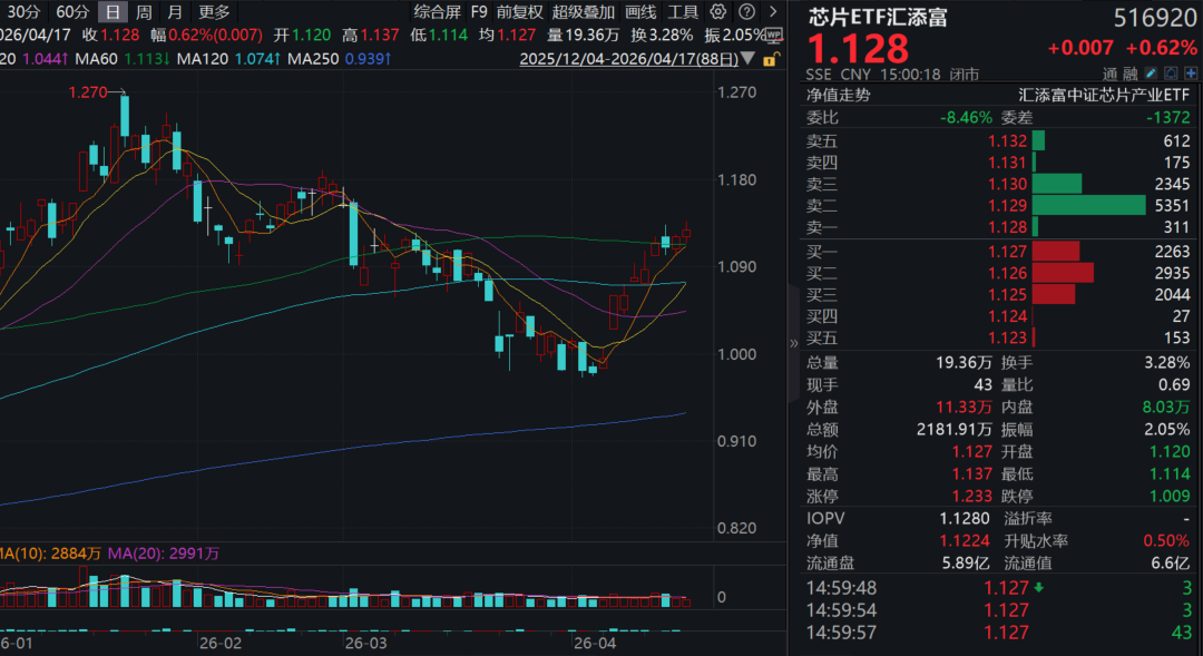4月17日,连续多日上攻之后,市场开始分化,主要股指涨跌互现,创业板指涨超1%,芯片板块逆势走强。全市场存储含量高、费率最低档的芯片ETF汇添富(516920)收涨0.62%,全天成交额超2100万元,强势两连阳!