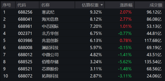 芯片ETF汇添富(516920)标的指数热门股涨跌互现:寒武纪、海光信息涨超2%,中芯国际涨超1%,兆易创新涨近1%;下跌方面,佰维存储跌超5%,拓荆科技跌超3%,中微公司、芯原股份跌超1%。