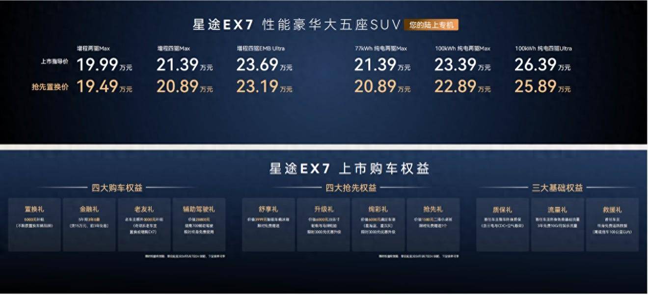 星途EX7提供纯电与增程双动力选择,共推出增程两驱Max、增程四驱Max、增程四驱EMB Ultra以及77kWh 纯电两驱Max、100kWh 纯电两驱Max、100kWh 纯电四驱Ultra六款车型,官方指导价为19.99万元—26.39万元,抢先置换价为19.49万元—25.89万元。与此同时,星途汽车官方还为用户提供了多重购车福利。