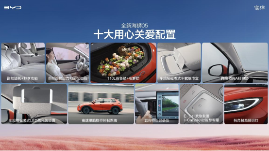 舒享方面,全新海狮05提供全新十大“用心关爱”配置,涵盖转角辅助照明灯、同级领先A柱视野、五向行车记录仪、E-Call紧急救援+I-Call 24小时智慧客服、电动尾门、主驾座椅记忆带迎宾功能、车规级磁吸式车载纸巾盒、车规级磁吸式LED柔光美妆镜等功能,细节体验全面跃升。