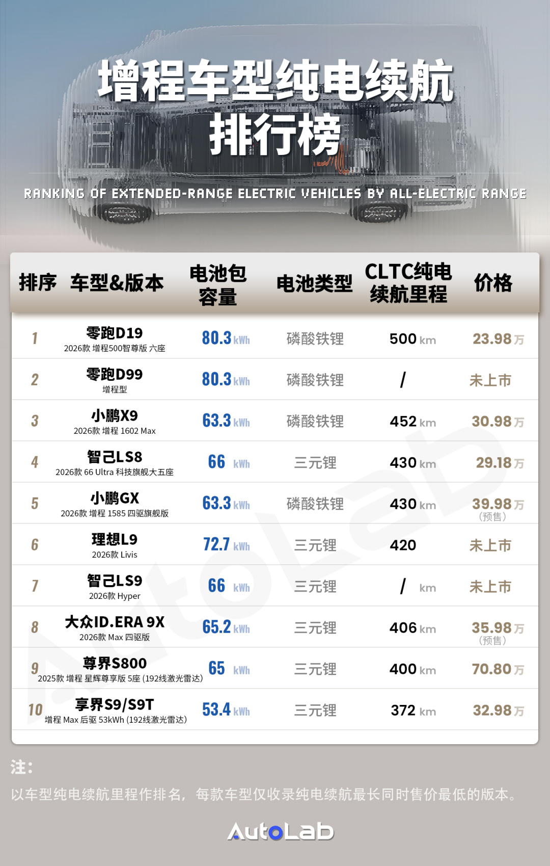 这份榜单中,纯电续航排名第一的增程车是零跑D19,500km CLTC纯电续航、80.3度磷酸铁锂电池、23.98万的定价,直接把增程混动的续航门槛拉到了新高度。
