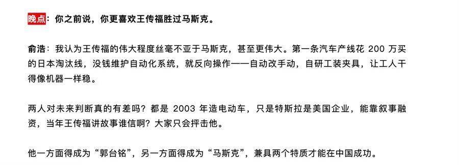但这样一个“狂人”却也有真心赞许的“老登”。日前,《晚点》有关俞浩的一篇专访中,出现了一个俞浩对于比亚迪董事长王传福的观点——“我认为王传福的伟大程度丝毫不亚于马斯克,甚至更伟大”。