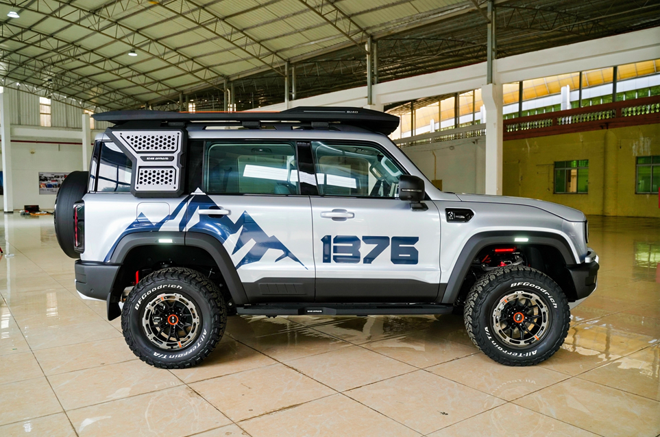 轻度改装主打一个颜值即正义。如果你主要在城市通勤,偶尔周末撒个野,那这四件套足够让你成为街头焦点。GT银雪域主题色膜是一款圣洁银色高分子贴膜,抗刮擦、保护原漆,质感不输原厂。雪域主题拉花融入藏地“1376”吉祥寓意与冈仁波齐图腾,文化属性拉满。分体式前保总成是原厂数据开模,严丝合缝,告别第三方改装的松散感。三段式车顶射灯免打孔安装,夜间穿越照明能力大幅提升,科技感炸裂。