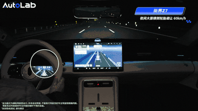 此时驾驶者完全无法看到藏在烟雾后方的轮胎,而尚界Z7则穿透烟雾,成功实现避让。