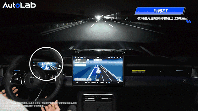 我们就测试了尚界Z7在黑夜强逆光环境下的绕障能力,并且是在120km/h的高速状态下,连续避让前方散落着的锥桶、纸箱以及黑色轮胎。