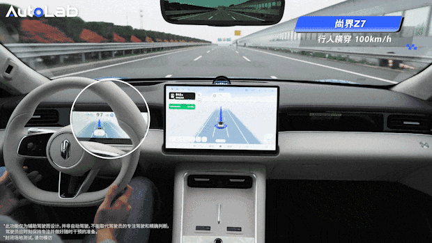 跟鬼探头一样,面对行人横穿这种场景,尚界Z7依旧是及时识别,而后稳稳刹停。