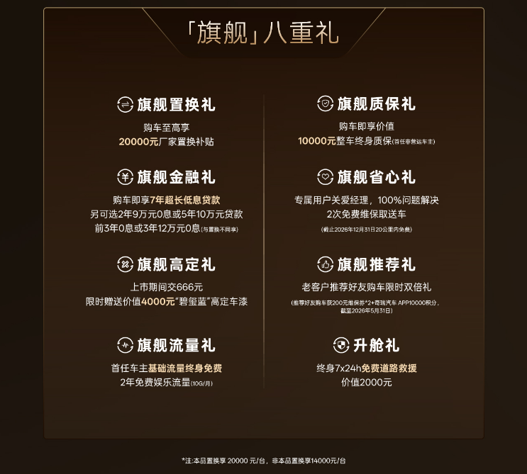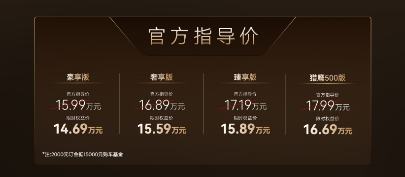 价格与权益方面,新车推出豪享版、奢享版、臻享版、猎鹰500版四款车型,官方指导价15.99万-17.99万元,限时权益价低至14.69万元起,以15万级价格带来40万级豪华体验。同时,奇瑞推出“旗舰八重礼”,包括至高20000元置换补贴、7年超长低息贷款、价值4000元高定车漆、终身整车质保等多重福利,最大化降低购车门槛,回馈消费者支持。