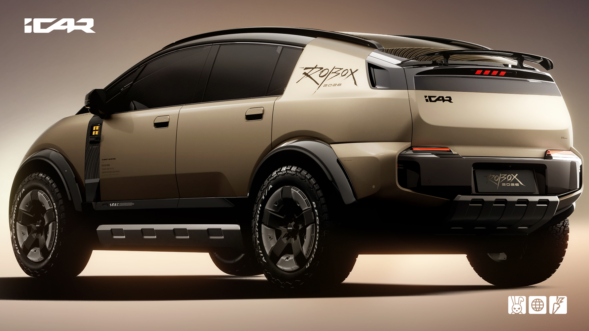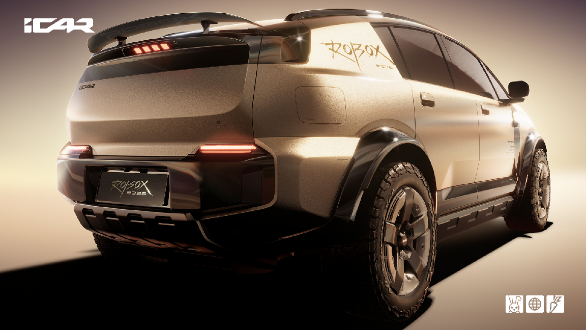 iCAR ROBOX概念车对iCAR“未来经典”设计语言进行更极致阐释。车头圆形与矩形灯组上下拆解,全新灯语精致兼具经典大气。车身上部分以OneBox纯粹形态,将低风阻与科技美学完美融合,腰线之下,以超高离地间隙、超大尺寸轮毂、宽体轮眉,营造刚柔并济的冲突美学。整体车身型面简洁,沿用科技岛、C柱盲窗、乐高式高位刹车灯等家族元素,极具辨识度。