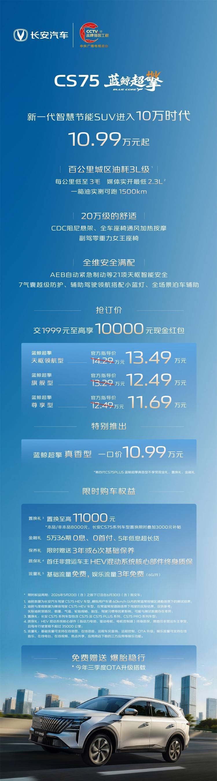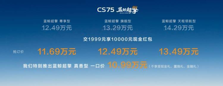 第四代CS75PLUS蓝鲸超擎发布抢订价:交1999元至高享10000元现金红包,蓝鲸超擎尊享型11.69万元、蓝鲸超擎旗舰型12.49万元、蓝鲸超擎天枢领航型13.49万元,并特别推出蓝鲸超擎真香型一口价10.99万元(不享受现金礼、置换礼、金融礼);除蓝鲸超擎真香型外,购其他配置车型用户可享五大限时购车权益:置换礼:置换至高11000元(本品/非本品8000元,长安CS75系列车型置换限时叠加3000元补贴);金融礼:5万36期0息、0首付、5年低息超长贷;保养礼:限时赠送3年或6次基础保养;质保礼:首任非营运车主HEV混动系统核心部件终身质保;流量礼:基础流量免费,娱乐流量3年免费(6G/月)。