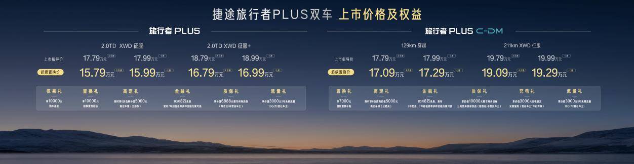 捷途旅行者PLUS(燃油版):提供2.0TD XWD征服版和征服+版两款配置,官方指导价17.79万-18.99万元。用户可享受“超级置换价”,实际支付价为15.79万-16.99万元。新车搭载荣获“中国心”十佳发动机称号的2.0TGDI涡轮增压发动机,匹配8AT变速箱,动力强劲可靠。