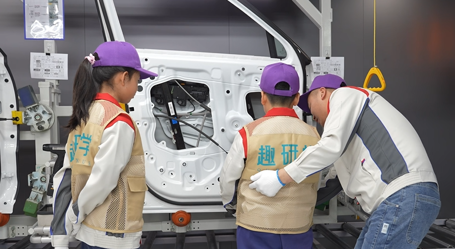 在教育展区,他与爱和城学校的孩子们一同体验 AI 画车、动手拆装发动机、参与品质门检验,用一堂沉浸式汽车课,道出一个被行业长期忽略的真相:具有中国特色的汽车文化,根在教育;产业真正的长期竞争力,藏在下一代的成长里。
