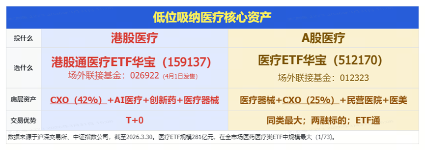 公开资料显示,医疗ETF华宝(512170)覆盖8只A股CXO龙头股,权重占比合计约25%(药明康德A股最新占比超12%)。港股通医疗ETF华宝(159137)覆盖9只港股CXO龙头股,权重占比合计超40%(药明康德港股最新占比达10.8%)。