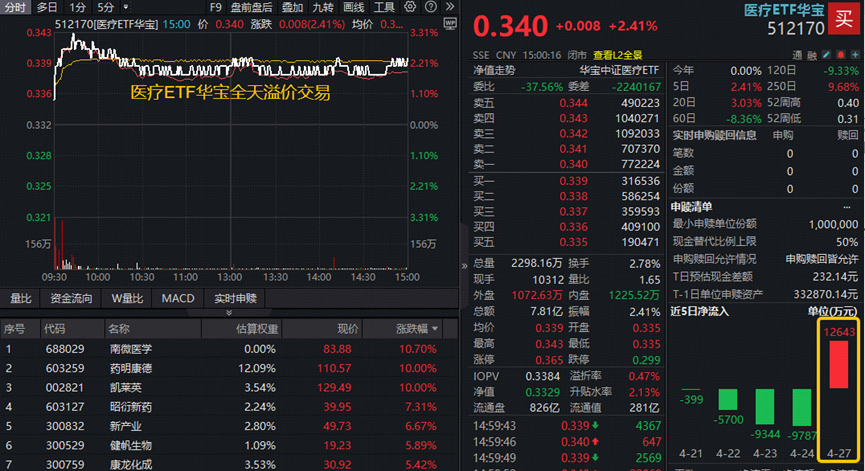 港股通医疗同样逆市表现,药明康德H股一度涨超17%,收涨13.57%,领跑所有港股通个股,带动港股通医疗ETF华宝(159137)摸高3.83%。尽管午后随市回落,但溢价逆向走高,最终收涨1.58%终结五连阴。