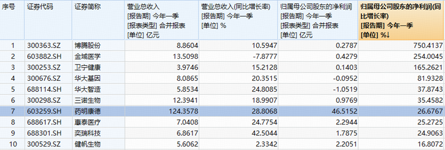 整体看A股医疗板块一季度业绩,截至当前,医疗ETF华宝32只成份股发布一季度,其中28股实现盈利,16股营收、净利同比双增,博腾股份净利同比增速超750%暂居首位,金域医学、卫宁健康同比高增254%、165%。
