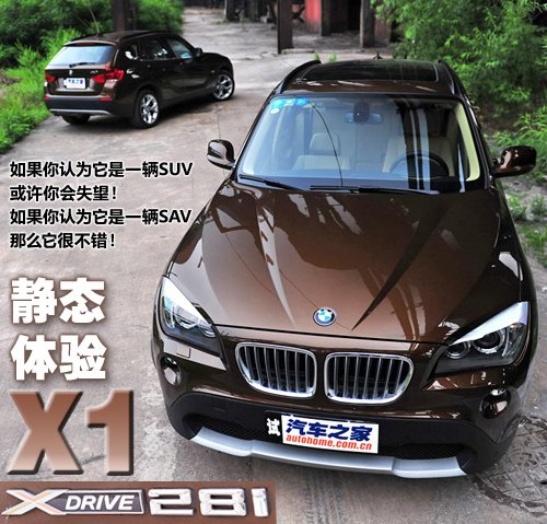 不管你想象中X1是什么样的一款车,在你看到它的第一眼,你一定会有所吃惊:这恐怕是我见过最矮的SUV了,它是SUV吗?其实,我更愿意你不要无时无刻地把它当做一款SUV来看待,甚至忘记它属于宝马的X家族(尽管是最小的一个),而是把它看成是一款旅行版轿车,只不过底盘稍高,具有四驱功能,有这些就够了。