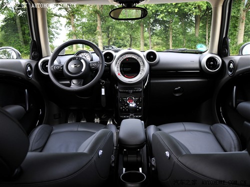 Countryman的内饰基本保持了MINI风格,只是在细节和功能性上增加了一些独特的设计。整个中控部分的大体造型都没有什么不同,但是那些亮银装饰被悄悄地丢掉了,比如方向盘上的徽标依旧,而左右多功能键和下方的银色饰板均变为黑色一体的,同样空调面板和下面按键区也是黑色的。于是,Countryman的风格离可爱就有了一些距离。
