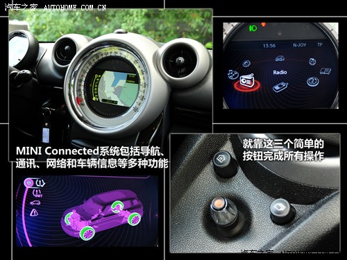 显示屏以及带USB音频接口的蓝牙无线设备为MINI Visual Boost收音机和MINI导航系统服务,MINI Connected系统功能列表可在苹果应用程序商店获得,系统应用程序的完整版将于2010年第4季度面世,其中包括网络收音机功能,浏览谷歌(Google)当地搜索引擎、接受谷歌车载地图发送(Google Send to Car)以及接受用户订阅的RSS新闻(可在车载显示器上浏览,并可使用选装语音输出功能进行阅读)。但是引入国内的车型将会有哪些功能,目前尚不得而知。