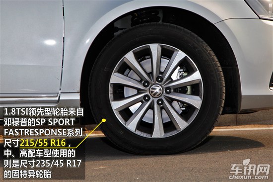 我们的试驾车1.8TSI领先型轮胎来自邓禄普的SP SPORT FASTRESPONSE系列,尺寸215/55 R16,是一款性能比较均衡的中端轮胎。中、高配车型使用的则是尺寸235/45 R17的固特异轮胎。