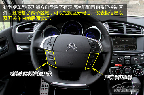 C4L 1.8L的总体内饰设计在之前测试的C4L 1.6THP相比并没有太大的变化。而跟随1.8L车型上市的劲驰版车型则主要增加了配彩色液晶屏的一体机、可调背景颜色的仪表盘以及功能更多的多功能方向盘。