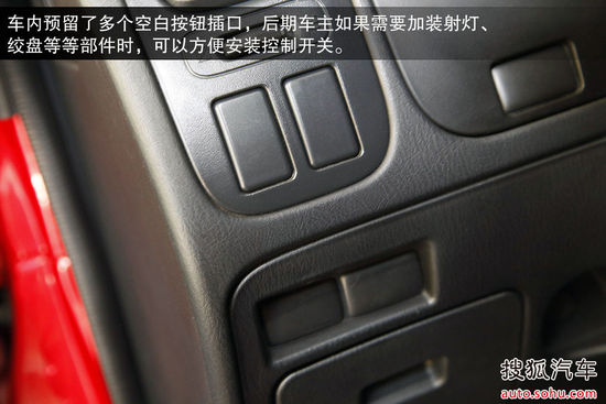 车内预留了多个空白按钮插口,后期车主如果需要加装射灯、绞盘等等部件时,可以方便安装控制开关。