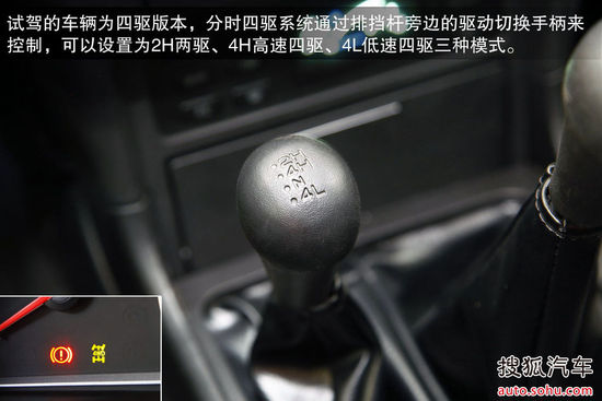 试驾的车辆为四驱版本,分时四驱系统通过排挡杆旁边的驱动切换手柄来控制,可以设置为2H两驱、4H高速四驱、4L低速四驱三种模式。