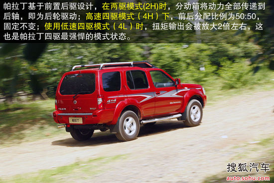 帕拉丁基于前置后驱设计,在两驱模式(2H)时,分动箱将动力全部传递到后轴,即为后轮驱动;高速四驱模式(4H)下,前后分配比例为50:50,固定不变;使用低速四驱模式(4L)时,扭矩输出会被放大2倍左右,这也是帕拉丁四驱最强悍的模式状态。