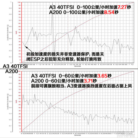 在关闭电子稳定系统的情况下,这两台小车都能充分释放发动机扭矩,让你尽情发挥,甚至出现长时间的打滑,在控制打滑以获得最佳加速能力的时候,两车在前段(0-60公里/小时)并驾齐驱,而在后段,A3的变速器表现得更为积极,最终0-100公里/小时加速要比A200快超过1秒时间,占据比较明显的优势。