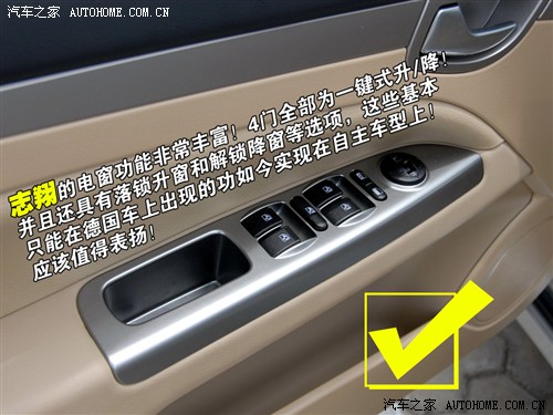 此次试驾的志翔(2.0自动豪华型)在电窗功能上真是下足了功夫!4门全部具有一键式升/降和防夹手功能,并且它还能在锁车后自动升起车窗以保证安全性!在同级车中,一般我们也只能在欧美车型上见到,如今,自主生产的志翔也同样拥有,我们应该给予掌声!其实,这些功能对于厂商来说实现起来并没有什么难度,一旦做为标配推出,用户便很容易得到满足,使用起来也贴心多了!