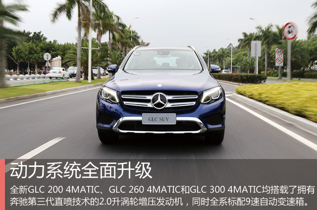 全新GLC 200 4MATIC、GLC 260 4MATIC和GLC 300 4MATIC均搭载了拥有梅赛德斯-奔驰第三代直喷技术的2.0升涡轮增压发动机,同时全系标配9速自动变速箱(9G-TRONIC)。我们试驾的这辆GLC 260 4MATIC豪华型,最大输出功率为155Kw/5500 rpm,最大扭矩350Nm/1200-4000rpm。从静止加速到100公里/小时仅需7.8秒,最高时速可达222公里,平均油耗为每百公里7.3升。