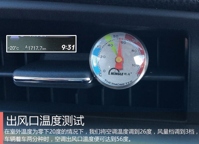 虽然已经是上午的9点31分,但黑河的气温为零下20度,我们将空调温度调制26度,风量档调到3档,车辆着车2分钟时,空调出风口温度便可达到56度,我相信这样的成绩是普通汽油车很难做到的。