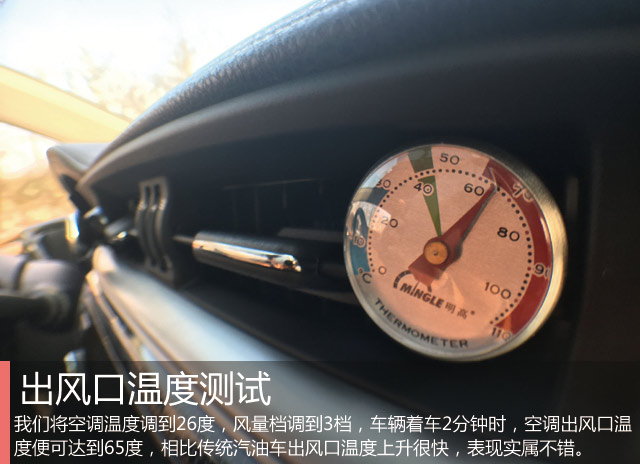 测试当天北京气温7度,我们将空调温度调制26度,风量档调到3档,车辆着车2分钟时,空调出风口温度便可达到65度,与传统汽油车的出风口温度相比上升很快,表现实属不错。而且值得一体的是,在车辆启动后,空调出风口温度虽没现在这么高,但出风仍然是暖风,这与传统汽油车相比有了较大进步。