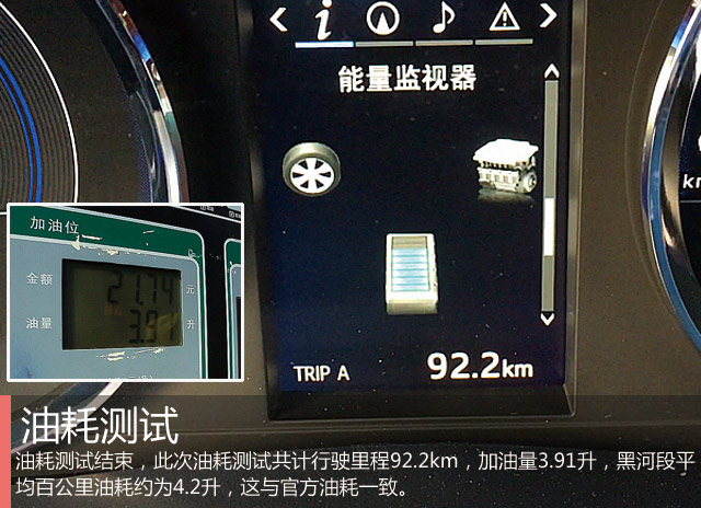 我们采用油箱加满出发,然后行驶覆盖了高速公路、城市拥堵道路、和行驶缓慢道路三种路况道路后,再把油箱加满的方式,跟据加油量和行驶公里数测出最终百公里油耗。