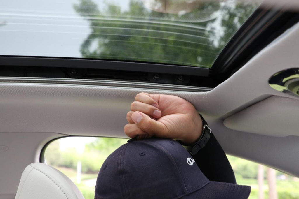 前排座椅,无论在坐垫的长度上,坐垫的厚度上都有着不错的乘坐质感。座椅设置到模特(身高175cm)的标准坐姿时,头部还有一拳的空间。