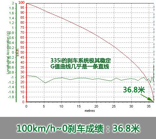 当速度达到100km/h之后,全力踩下刹车踏板,顿时感觉到了充足的刹车力度,ABS工作非常的积极,刹车踏板没有任何打脚的感觉,最终36.8米的成绩还是让我们吃了一惊,而试想如果更换成245宽度的轮胎,完全有可能杀进35米。