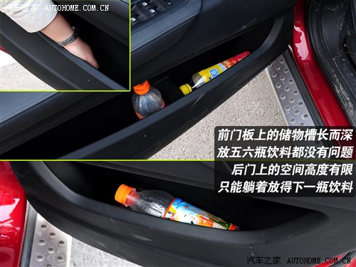 X6拥有宽大的车门,所以上面的储物空间也很大,不过这样的情况只发生在前排,前门板上放五六瓶饮料似乎都没有问题,而后门板上只能平躺着放饮料。