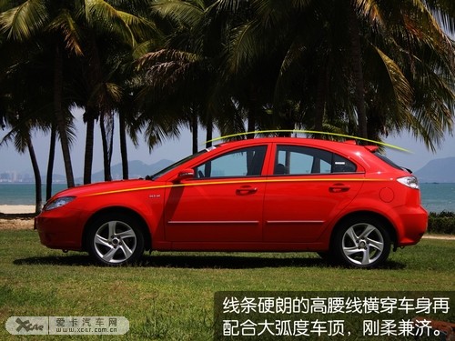 流畅简洁的前盖线条、锋锐车灯与5门掀背设计相得益彰,线条硬朗的高腰线横穿车身,再配合大弧度车顶,刚柔兼济。