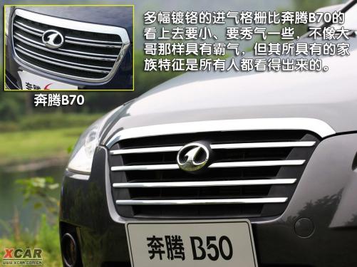 从外观上来讲,小奔腾的称呼用在奔腾B50上真的再合适不过了。在它的身上可以看到许多同门大哥奔腾B70的影子,不过似乎所有位置又都小了一号。多幅镀铬的进气格栅比奔腾B70的看上去要小,而且还显得更加秀气一些,不像同门大哥那样具有霸气,但其所具有的家族特征是所有人都看得出来的。两侧大灯虽然也采用了类似“L”型的设计,不过与奔腾B70快要瞪出来的那对眼睛相比,奔腾B50的双眼倒是属于比较聚光、比较有神的那种风格了。