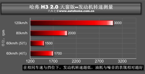 在一段无车的公路上,我们测得H3的实际噪音是:60km/h:66.5分贝;80km/h:68.8分贝;120km/h:73.2分贝;怠速为53.1分贝。这样的成绩比我们当初预想的要低了不少,虽然没有达到我们优秀的评判标准,但是对于H3这样的车型来说我们也是可以接受的。