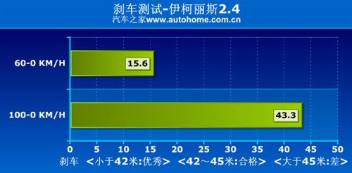 之前认为装配235mm轮胎以及4轮碟刹的伊柯丽斯能有不错的刹车表现,但是43.2米的刹车平均成绩实在让人没想到,其中,该车还曾达到过44.2米,很一般的成绩。总结原因,刹车总泵的供给力度应该加强,同时,行程偏长的悬挂也带来了负面的影响,刹车时,前悬挂的压缩比较明显,重心靠前也导致了前刹车系统的负荷偏大。