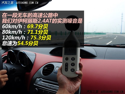 噪音测试:在一段无车的高速公路中,我们对伊柯丽斯2.4AT的实测噪音是:60km/h:69.7分贝;80km/h:71.1分贝;120km/h:75.3分贝;怠速为54.5分贝,很遗憾的说整体分值都偏高,我们认为4AT变速箱的问题并不是主要,从发动机转速测量图中可以看到除120km/h外,其余两个速度下的转速并不高。最大的原因是发动机本身释放的声源,我想这台原装的三菱发动机想要故意制造运动效果,让驾乘者可以无时无刻的沉浸在有些激情的声场中,影响舒适是肯定的,但对于这类跑车来说也是可以接受的。