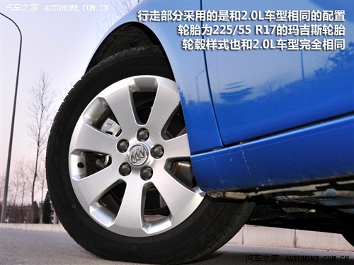 外观方面,我们拿到的这辆测试车是跟随1.6T车型一起推出的雅蓝色,看上去明显要活跃很多,运动气息浓厚。不过在经过对比之后我们发现,除了前翼子板和车尾的“T”标志外,它和新君威2.0L车型没什么区别,甚至最能体现特点的行走装备也还是那四条尺寸为225/55 R17的玛吉斯牌轮胎,轮毂样式也没变,多少让人有点失望。