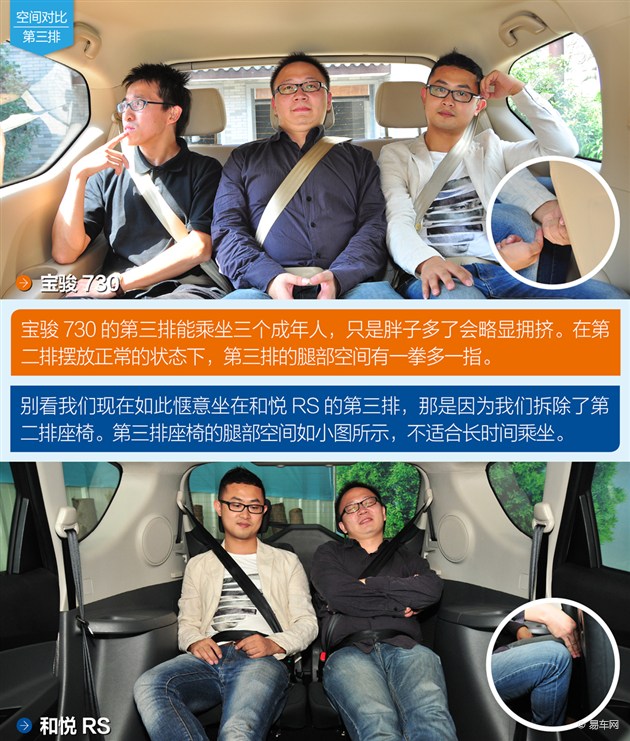 由这两幅小图我们可以看出,宝骏730的第三排座椅距离车尾门有一定的距离。而和悦RS的第三排座椅若将头枕完全拉出后几乎与尾门贴近。造成这种原因除了车身结构有所不同以外,还与宝骏730多出的135mm车身长度有关。