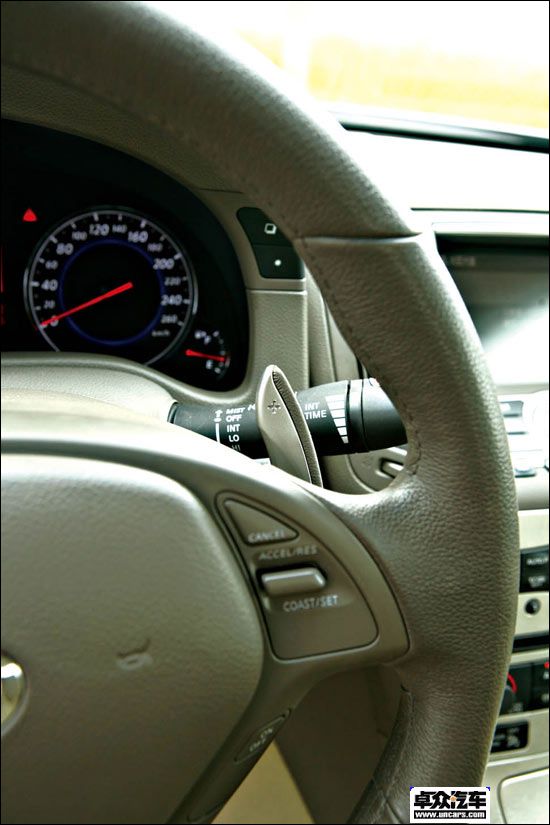中控台以及变速器面板等处采用了经过拉丝处理的铝质饰板,很特别,肯定能受到年轻人的喜爱。在G35的车内,驾驶者是绝对的中心,由真皮包裹的方向盘很粗壮,出色的手感会增强你的驾控欲望,两侧的换挡拨片像两个长长的獠牙,样式很夸张。当调节方向盘角度时,仪表盘会与方向盘一同移动,好处是能让驾驶者更直观地观察到仪表信息。