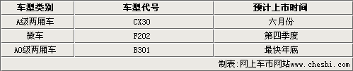 长安奔奔系列产品阵容已经初见规模,目前需要完善产品系列的是A0级车型和A级车型。长安汽车采购部副部长陈方在接受网上车市网站专访的时候表示,今年六月份开始,CX30、F202、B301将陆续上市。据了解,这三款新车分别是A级两厢车、微车和A0级两厢车,预计今年年内有望全部推出上市。
