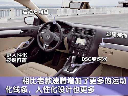 内饰部分更多的细节与现款速腾同样非常相似,例如仪表台的整个造型特别是变速器挡把部分的斜坡设计在新Jetta车型让依然保留。不过即便如此,仪表台的细微功能还是会相比现款车型更加人性化和细致,而变速器挡把所连接的变速器也会是百分之百的DSG双离合变速器而非tiptronic自动变速器。