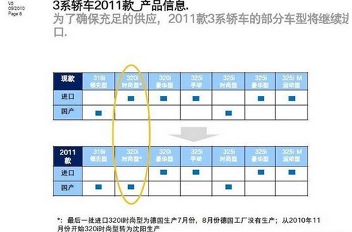 2011款BMW 3系的变化特征之一是在车型的生产方面有了细微的调整,2010款车型中只有318i领先型和325i时尚型由华晨宝马生产。其他车款均由宝马位于德国慕尼黑的组装厂生产,属于标准的“进口车”。