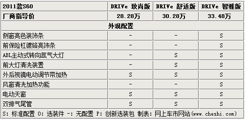 在外观配置上,S60 1.6T三款车型略有差异,其中高配的DRIVe 智雅版配置侧窗亮条和前保险杠亮条,主动转向氙气大灯和大灯清洗是舒适版和智雅版的标配,低配的致尚版没有配置。不过电动天窗和双排气尾管为S60 1.6T的标准配置,天窗这是比较实用的装备。