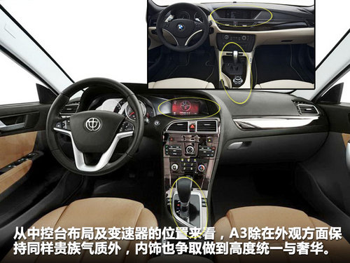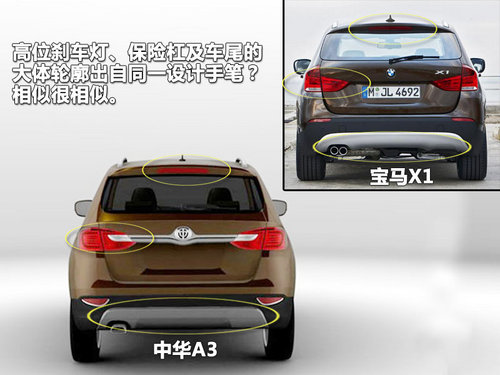 从侧面身段看,车顶同样继承了越野车常用的装饰性配置-镀铬行李架,中华A3从前到后微微上扬腰线同X1采用了同样的设计风格。和宝马X1从侧面的轮毂造型和车身的轮廓上相比较,两者的设计风格有异曲同工之妙,只是细微的进行了调整。这也是将宝马的设计理念很好传承与发扬的结果,以资本换技术的汽车发展策略得到了诠释。