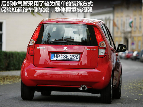尾部是Splash最具特色的地方。类似雪铁龙C4 Coupe,Splash采用竖直式尾窗设计,不仅仅使得外形增添几分时尚,还在一定程度上保证了后排乘客的头部空间。15寸七幅式轮毂风格与车身设计趋近。竖条式尾灯也颇为醒目,对行车安全有一定的提高作用。从侧面看去,尾部似乎向内凹陷,尾灯呈“>”箭头形状,个性十足。位居中央的红色雾灯设计来自赛车,给小车带来几分动感。